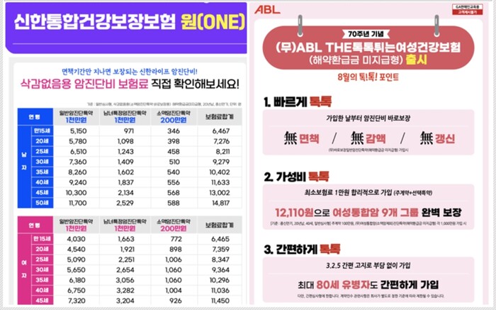 | ▲신한라이프의 여성건강보험 '원'과 ABL생명의 '톡톡튀는 여성건강보험'. [이미지=GA영업현장 상품소식지 캡처] |