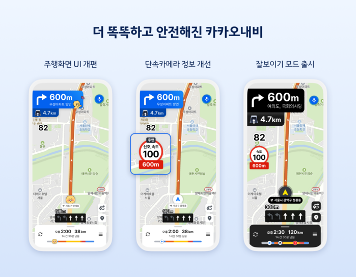 카카오모빌리티는 운전 중 내비 화면을 여러 번 조작하지 않고도 다양한 주행 관련 정보를 한눈에 볼 수 있도록 카카오내비의 주행 화면을 대폭 개편했다.