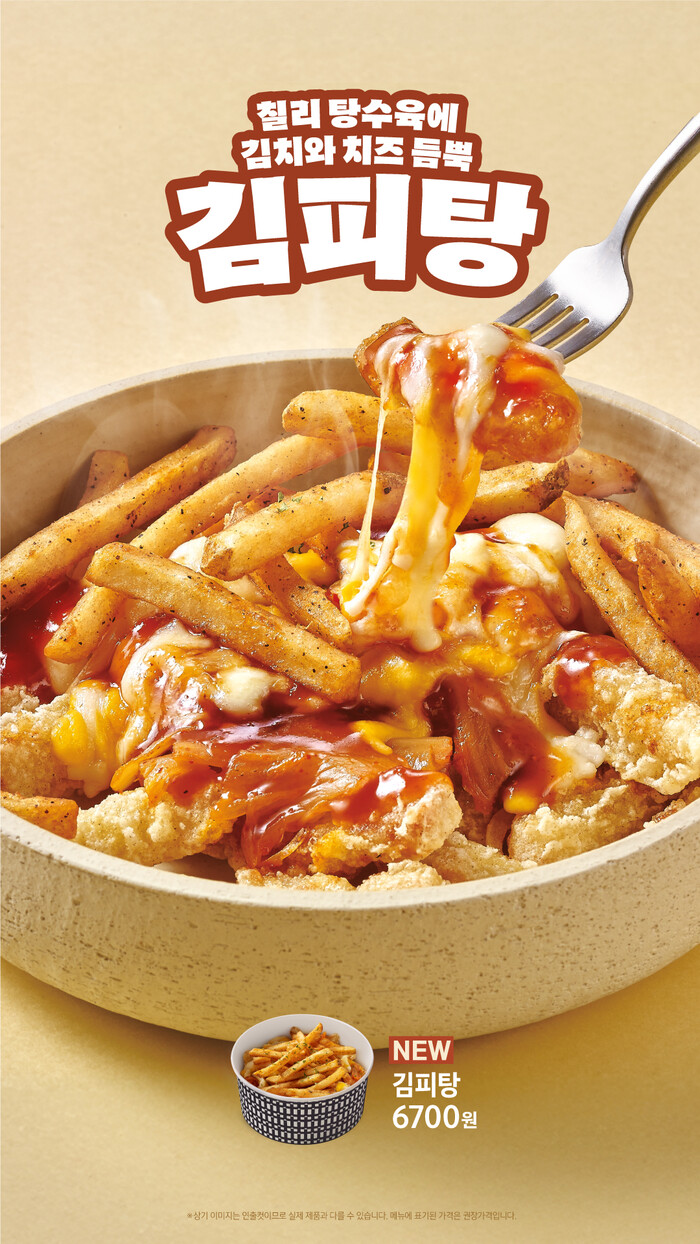 ‘김피탕’은 김치·피자·탕수육을 활용한 요리로, 달콤한 찹쌀탕수육 위에 국산 볶음김치와 피자치즈, 케이준 후라이, 양파, 칠리소스, 탕수육 소스를 곁들인 퓨전 메뉴다.