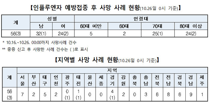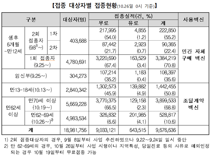 인플루엔자 예방접종 현황을 보면, 26일 0시 기준 약 1468만 건이 등록됐으며, 이 중 국가예방접종사업 대상자의 접종건수는 968만 건으로 집계됐다.