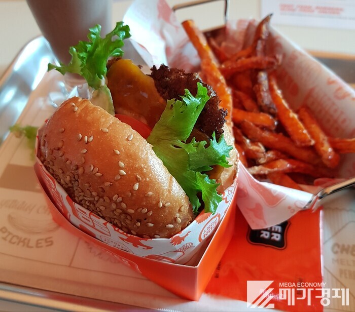 | ▲ 슈퍼두퍼의 '슈퍼싱글 버거'와 '스위트포테이토 프라이즈' [사진=김형규 기자] |