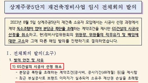 ▲ 상계주공5단지 재건축정비사업 임시 전체회의 발의 자료 일부 발췌. [이미지=조합원] |
