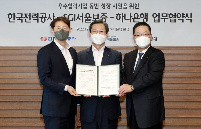 하나은행이 한국전력공사,SGI서울보증과 손잡고 중소기업과의 동반성장을 위한 ESG경영 협업 체계를 강화한다. 3사는 유동성에 어려움을 겪는 중소기업에 실질적 금융지원을 위해 협력해 가기로 했다.