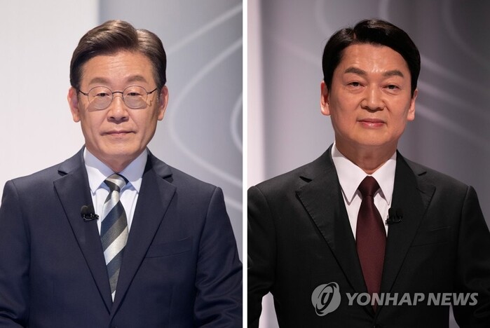 ▲ 지난 2월 25일 서울 상암동 SBS 스튜디오에서 열린 중앙선거관리위원회 주관 제20대 대통령선거 후보자 2차 정치분야 방송토론회 당시 더불어민주당 대선후보와 국민의당 대선후보로 각각 참석했던 이재명 전 경기지사와 안철수 대통령직인수위원장. [사진=연합뉴스] |