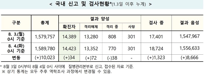 중앙방역대책본부(방대본)는 4일 0시 기준으로, 전날 대비 코로나19 신규 확진자가 34명이 발생해, 지금까지 누적 확진자수는 1만4423명이라고 밝혔다.