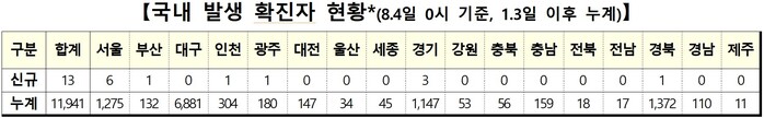 지역별로 국내발생 확진자 13명을 보면 서울 6명, 경기 3명, 부산·인천·광주·경북 각 1명 순이었다.