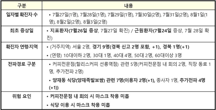 ▲ 서울 강남구 커피전문점 및 양재동 식당 관련 확진자 현황표. [출처= 중앙방역대책본부] |