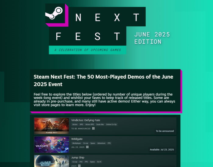 [메가경제=이상원 기자] 넥슨은 CAG스튜디오에서 개발 중인 신작 액션 RPG ‘빈딕투스: 디파잉 페이트(Vindictus: Defying Fate)’가 스팀에서 발표한 ‘스팀 넥스트 페스트(Steam Next Fest) 6월 인기 데모 TOP 50’ 중 가장 많이 플레이된 데모에 선정됐다고 17일 밝혔다.