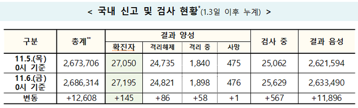 질병관리청 중앙방역대책본부(방대본)는 6일 0시 기준으로 전날 대비 일일 신규 확진자수가 145명 추가 발생해 누적 확진자는 2만7195명이라고 밝혔다.
