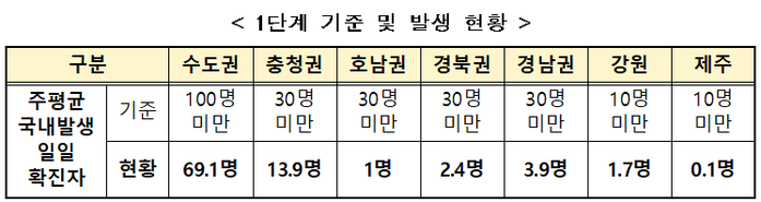 손영래 중앙사고수습본부(중수본) 전략기획반장은 "1주일간 현황을 보면 전국은 90명대 초반, 수도권은 약 70명 수준, 충청권은 14명, 그 외 권역은 모두 1∼4명 수준으로 1단계 기준을 넘는 곳은 없다"고 설명했다.
