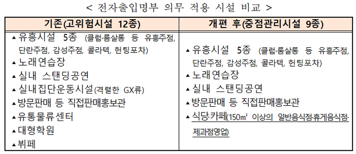 ▲ 7일부터 사회적 거리 두기가 개편됨에 따라 전자출입명부가 의무화되는 시설이 조정된다. 표는 전자출입명부 의무 적용 시설 비교. [출처= 보건복지부] |