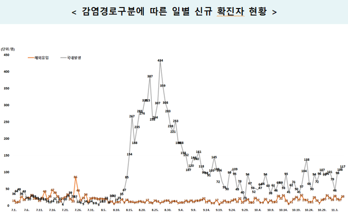 한편 중앙재난안전대책본부(중대본)는 이날 브리핑에서 최근 1주일(10.31∼11.6)간 지역발생 일일 확진자 수는 92.1명으로, 전국이 거리두기 1단계 기준에 부합했다며 7일부터 적용되는 새로운 ‘사회적 거리두기’ 체계에서도 1단계를 유지하기로 했다고 밝혔다.