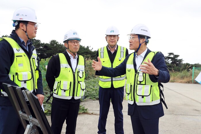 ▲14일 호남고속철도 신작교~어량교 구간 현장점검을 하고 있는 이성해 국가철도공단 이사장(오른쪽 첫 번째) |