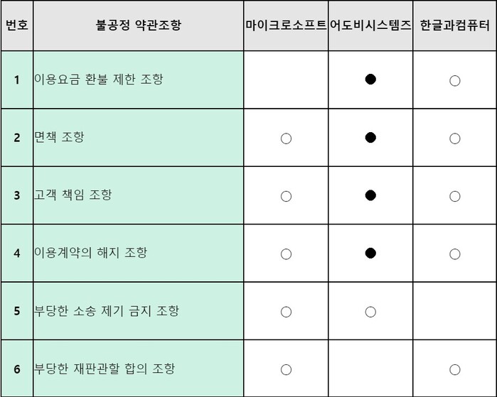 공정위에 따르면 MS‧한컴은 문제가 되는 약관조항을 모두 자진 시정했으나 어도비는 이용요금 환불 제한 조항 등 일부 약관조항을 시정하지 않아 여전히 시정 권고 대상이다.