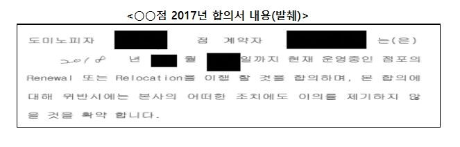 이와 함께 특정일까지 점포환경개선을 이행할 것을 합의하고, 이를 위반할 경우 가맹본부의 어떠한 조치에도 이의를 제기하지 않을 것을 확약한다는 내용의 합의서를 징구하는 등 가맹점주를 직접 압박하기도 했다.