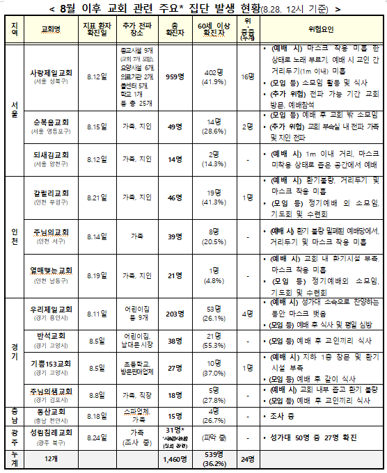 28일 정오 기준 방대본의 ‘8월 이후 교회 관련 주요 집단발생 현황’에 따르면, 코로나19 확진자가 발생한 교회는 모두 12개이며, 확진자수는 총 1460명이다.