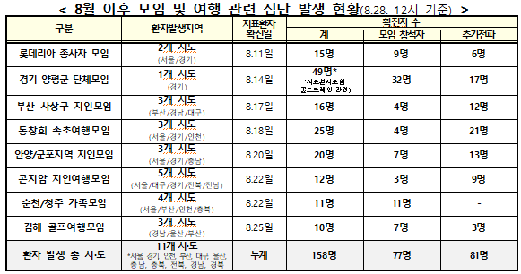 ▲ 28일 정오 기준 8월 이후 모임 및 여행 관련 집단 발생현황. [출처= 중앙방역대책본부] |