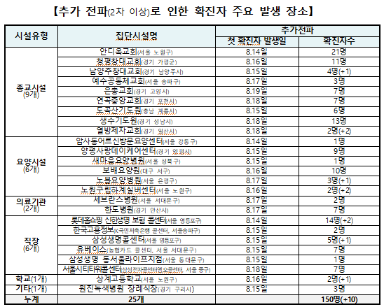 현재까지 사랑제일교회 관련 추가 전파로 인한 확진자 발생장소는 25개소이며 확진자는 총 150명으로 접촉자 조사를 진행 중이다.