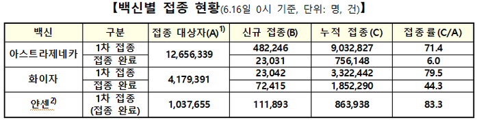 백신별로 보면 전날 하루 아스트라제네카(AZ) 48만2246명, 화이자 2만3042명, 얀센 11만1893명이다.