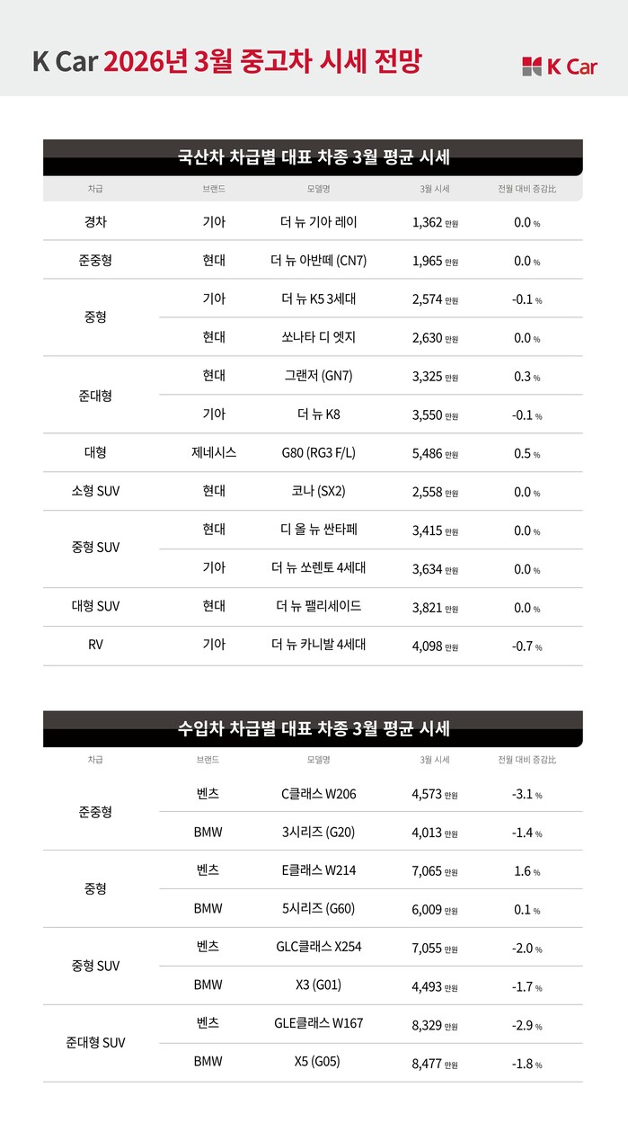 [메가경제=정호 기자] 국내 최대 직영중고차 플랫폼 기업 K Car(케이카)는 출시 10년 이내 740여 개 중고차 모델의 평균 시세를 분석한 결과, 국산차와 수입차 평균 시세는 각각 0.3%, 0.9% 소폭 하락한 반면 실용성과 가격 경쟁력을 갖춘 소형 SUV는 상승세를 보이고 있다고 26일 밝혔다.