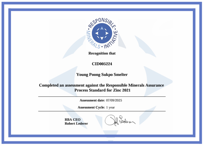 영풍 관계자는 “당사는 RMAP 기준에 따라 책임광물 공급망 및 분쟁광물 리스크를 체계적으로 관리하고 있다”며 “앞으로도 글로벌 기준에 부합하는 공급망 관리와 ESG 경영을 지속 강화해 나갈 계획”이라 밝혔다.