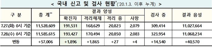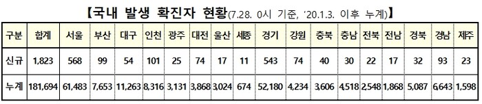 중앙방역대책본부(방대본)는 28일 0시 기준으로 신규 확진자가 1896명이나 발생해 누적 19만3427명(해외유입 1만1733명)으로 집계됐다고 밝혔다.