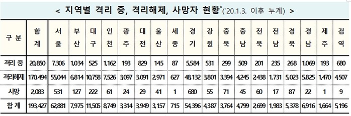 ▲ 28일 0시 기준 코로나19 지역별 격리 및 사망자 현황. [출처=중앙방역대책본부] |