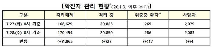 ▲ 28일 0시 기준 코로나19 확진자 관리 현황. [출처=중앙방역대책본부] |