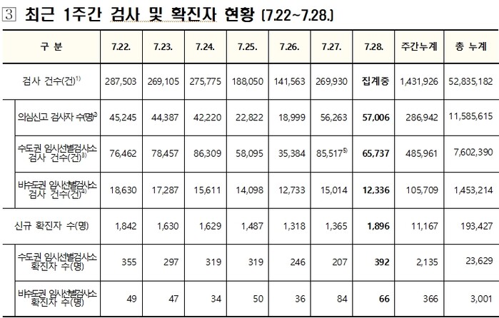 ▲ 최근 1주간 검사 및 확진자 현황. [출처=중앙방역대책본부] |
