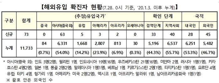 해외유입 확진자 73명 중 33명은 입국 검역단계에서 확인됐고, 40명(경기 14명, 서울·경남 각 5명, 부산·광주·전남 각 3명, 대구·대전·인천·울산·경북·전북·충남 각 1명)은 지역사회에서 자가격리중 확진됐다. 국적별로는 내국인 28명, 외국인 45명이다.