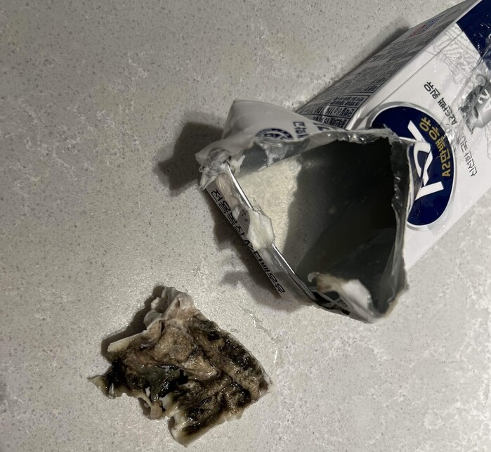 | ▲ 연세유업에서 판매하는 팩 멸균우유에서 곰팡이로 의심되는 이물질이 발견돼 식약처로 전달됐다.[사진=블라인드 캡처] |