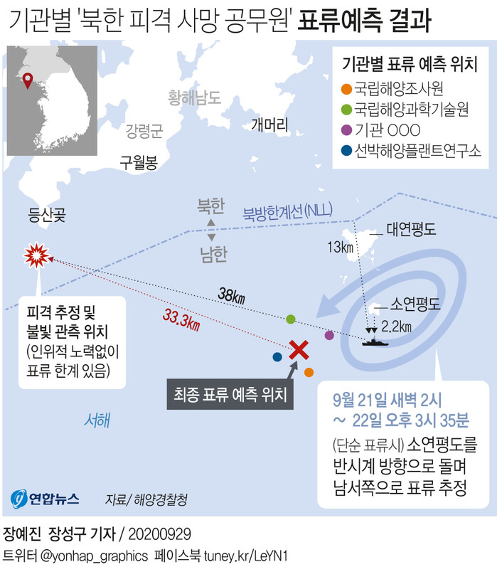 윤 국장은 공무원 A씨가 실종됐을 당시 소연평도 인근 해상의 조류와 조석 등을 분석한 '표류 예측' 결과도 그의 월북 정황을 뒷받침한다고 설명했다.