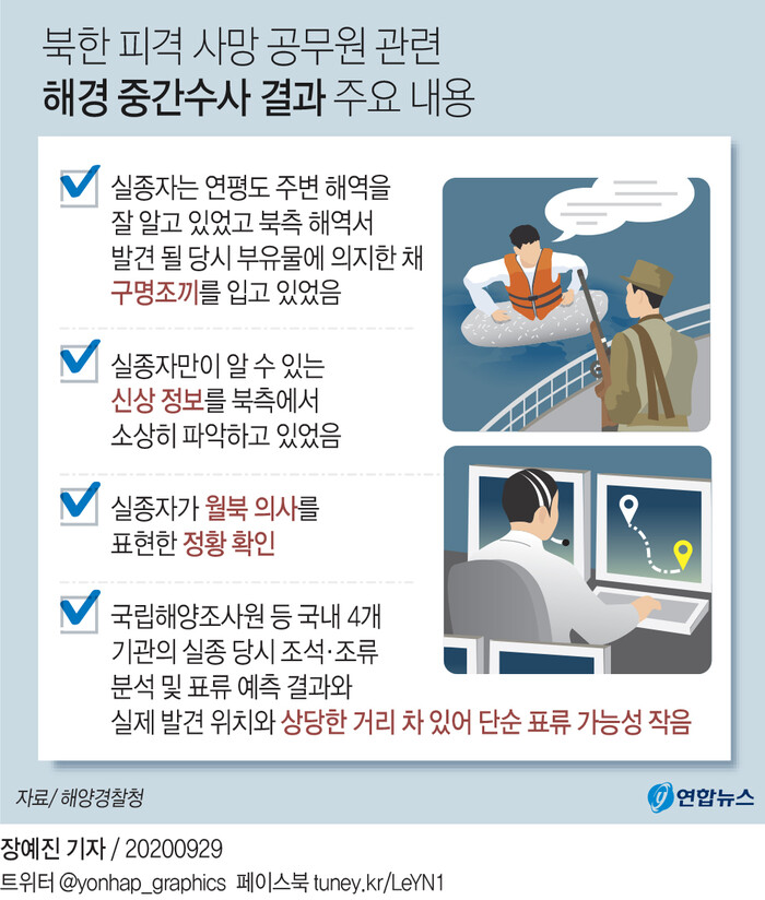▲ 북한 피격 사망 공무원 관련 해경 중간수사 결과 주요 내용. [그래픽= 연합뉴스] |