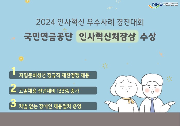 [메가경제=오민아 기자] 국민연금공단(이사장 김태현)은 11일 인사혁신처 주관으로 개최된 ‘제19회 인사혁신 우수사례 경진대회’에서 ‘인사혁신처장상’을 수상했다고 12일 밝혔다.