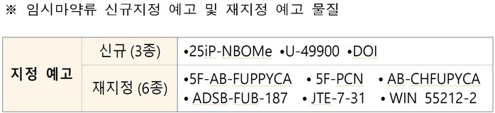 한편, ‘5F-AB-FUPPYCA’ 등 6종은 지정 효력이 오는 9월 18일에 만료될 예정이다. 국민 보건상 위해 우려를 고려하여 향후 3년간 임시마약류로 다시 지정 예고한다.