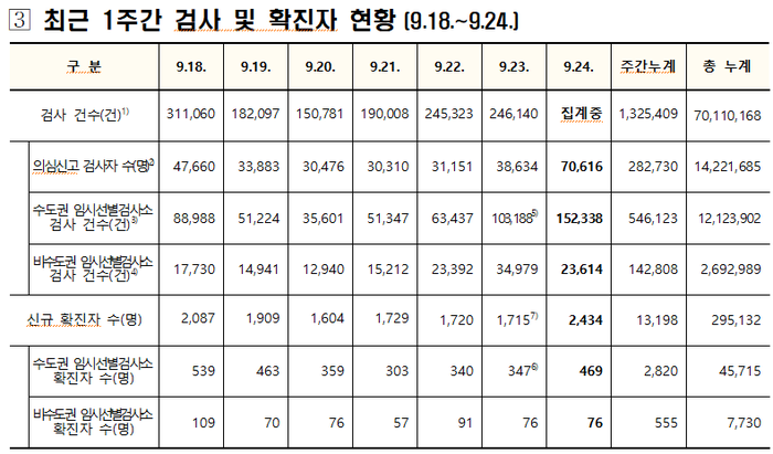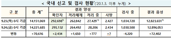 중앙방역대책본부(방대본)는 24일 0시 기준으로 신규 확진자가 2434명 추가 발생해 누적 29만5132명(해외유입 1만4275명)으로 집계됐다고 밝혔다.