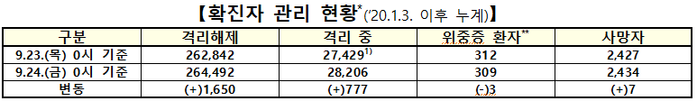 ▲ 24일 0시 기준 코로나19 확진자 관리 현황. [출처=중앙방역대책본부] |