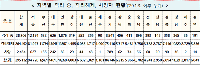 전날보다 7명이 더 목숨을 잃으면서 누적 사망자는 2434명으로, 국내 평균 치명률은 0.82%를 기록했다. 최근 사흘 동안에만 21명(6명→8명→7명)이 세상을 떠났다.