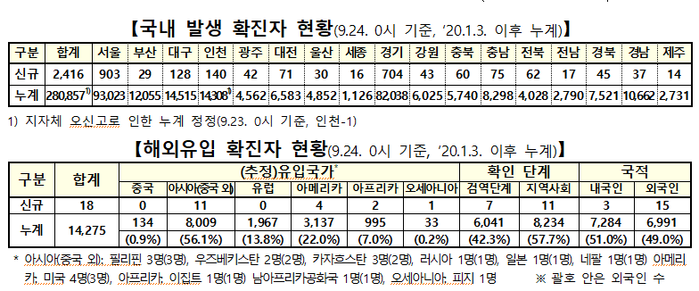 지역 2416명-해외 18명…누적 29만5132명, 사망자 7명 추가 총 2434명