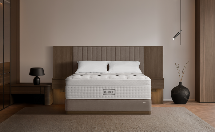 구조 측면에서는 박스 스프링 기반의 투매트리스 설계를 적용했다. 세로 패턴의 쿠션형 헤드보드와 우드 몰딩 마감과 더불어 바닥 밀착형 구조로 먼지 유입을 최소화했다.