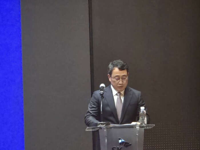 | ▲유영상 SK텔레콤 CEO가 4일 민관합동조사단의 SK텔레콤 사이버 침해사고 조사결과 발표 직후 진행된 기자간담회에서 발언하고 있다. [사진=황성완 기자] |
