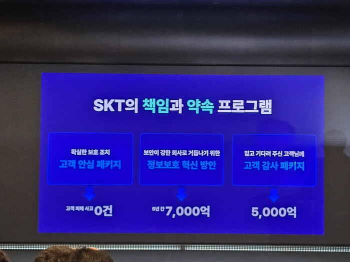 책임과 약속 프로그램은 침해사고로 인한 고객의 피해를 원천 차단하는 ▲'고객 안심 패키지'와 향후 5년간 총 7000억원 규모의 투자가 이뤄지는 ▲‘정보보호 혁신안’, 2400만 SK텔레콤 고객이 모두 이용 가능한 5000억원 규모의 ▲‘고객 감사 패키지’ ▲약정고객 해지 위약금 면제’ 등으로 구성됐다.
