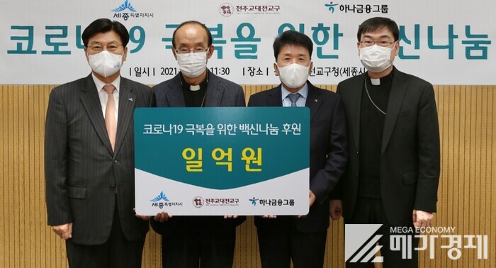 하나금융그룹(회장 김정태)은 지난 19일 세종시 천주교 대전교구청에서 전세계 코로나19백신 빈곤국을 지원하기 위한 한국천주교회 '백신나눔운동' 후원의 일환으로 천주교 대전교구에 기부금 1억원을 전달했다고 밝혔다.