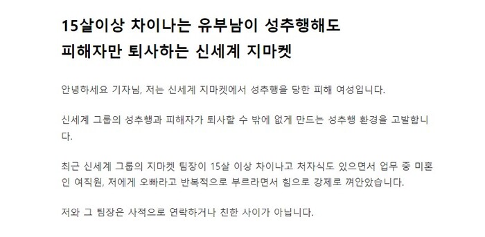 해당 피해자라고 밝힌 A 씨 제보에 따르면 지난해 10월 신세계 G마켓 사내 워크숍에서 유부남인 B 팀장은 15살 이상 연하의 여성 A 씨에게 자신을 ‘오빠’라고 부르라며 등 뒤에서 강제로 끌어안는 등의 성희롱과 성추행을 저질렀다.