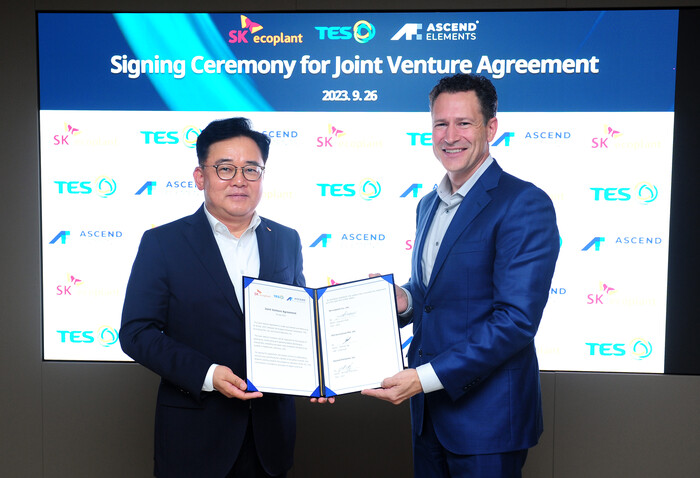 이번 합작법인은 미국 내 첫 한·미 합작 폐배터리 재활용 기업으로, 지분율은 SK에코플랜트 64%, 테스 11%, 어센드 엘리먼츠 25%다.
