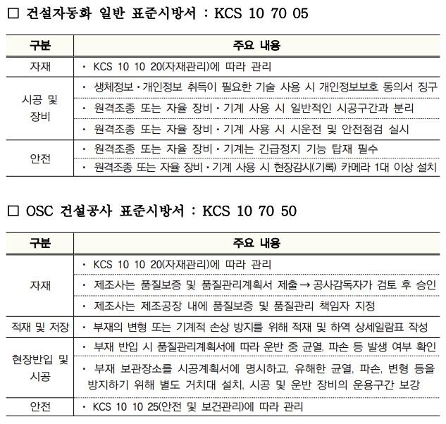 이들 기법은 공사 기간 단축과 시공 품질 확보, 안전사고 예방 등 다양한 장점이 있지만, 그간 공통 적용할 수 있는 시공 기준이 존재하지 않아 적극적으로 활용하기에 어려움이 있었다.