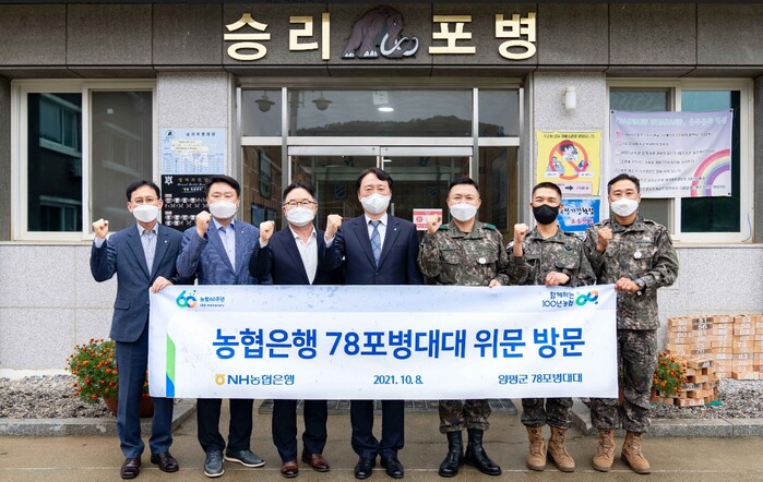 NH농협은행 권준학 은행장은 지난 8일 경기도 양평에 위치한 78포병대대를 방문해, 국군 장병들의 노고에 감사의 뜻을 전하고, 장병들의 병영생활 개선과 복지증진을 위해 위문금 1000만원을 전달했다고 10일 밝혔다.
