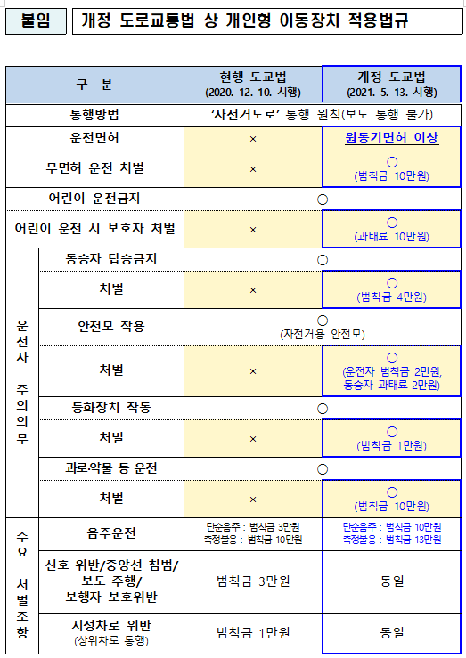 다만, 청소년들의 개인형 이동장치 이용 증가에 대한 우려와 운전자 주의의무 위반에 대한 제재가 없어 실효성 문제가 제기됐고, 지난해 12월 9일 강화된 도로교통법이 국회를 통과했다.
