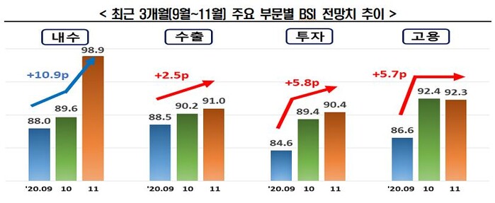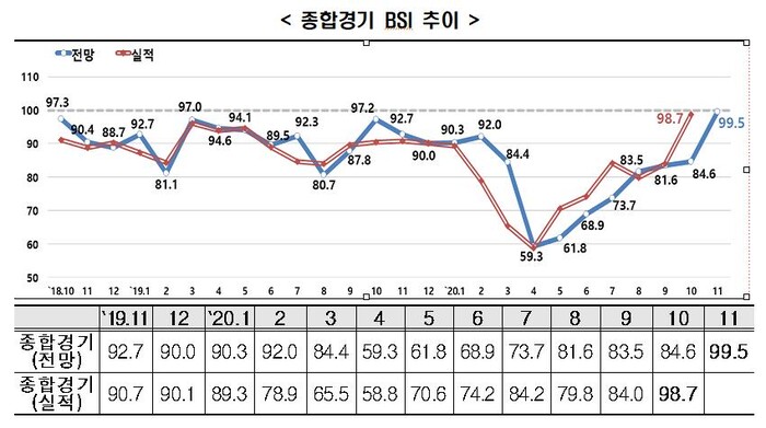 10월 실적치는 98.7를 기록해 전망치와 함께 코로나19 영향이 다소 축소되며 전월(84.0) 대비 14.7p나 상승했다.