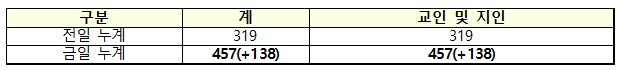 중앙방역대책본부(방대본)는 18일 오후 정례브리핑에서 이날 정오 기준으로 사랑제일교회와 관련해 접촉자 조사 중 138명이 추가 확진되어 현재까지 교인 및 지인의 누적 확진자는 총 457명이라고 밝혔다.